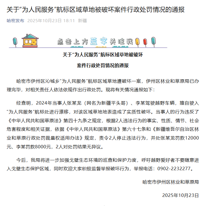 新京报讯 据哈密发布微信公众号消息,哈密市伊州区沁城乡“为人民服务”航标区域草地遭破坏一案,伊州区林业和草原局已办理完毕,对相关责任人依法依规作出行政处罚。现将有关情况通报如下: